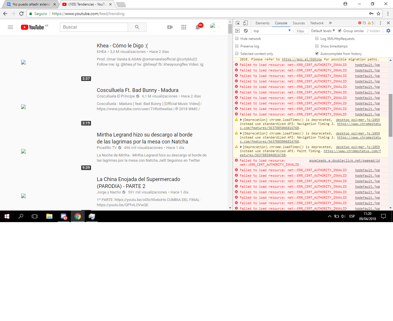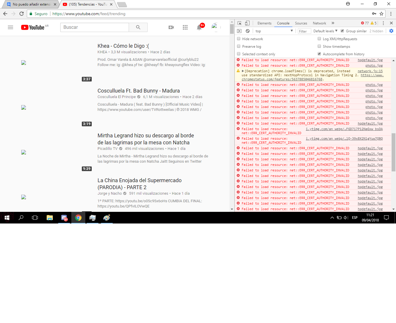 > No puedo añadir extensiones, imágenes de perfil no se visualizan, miniaturas de youtube no cargan.
