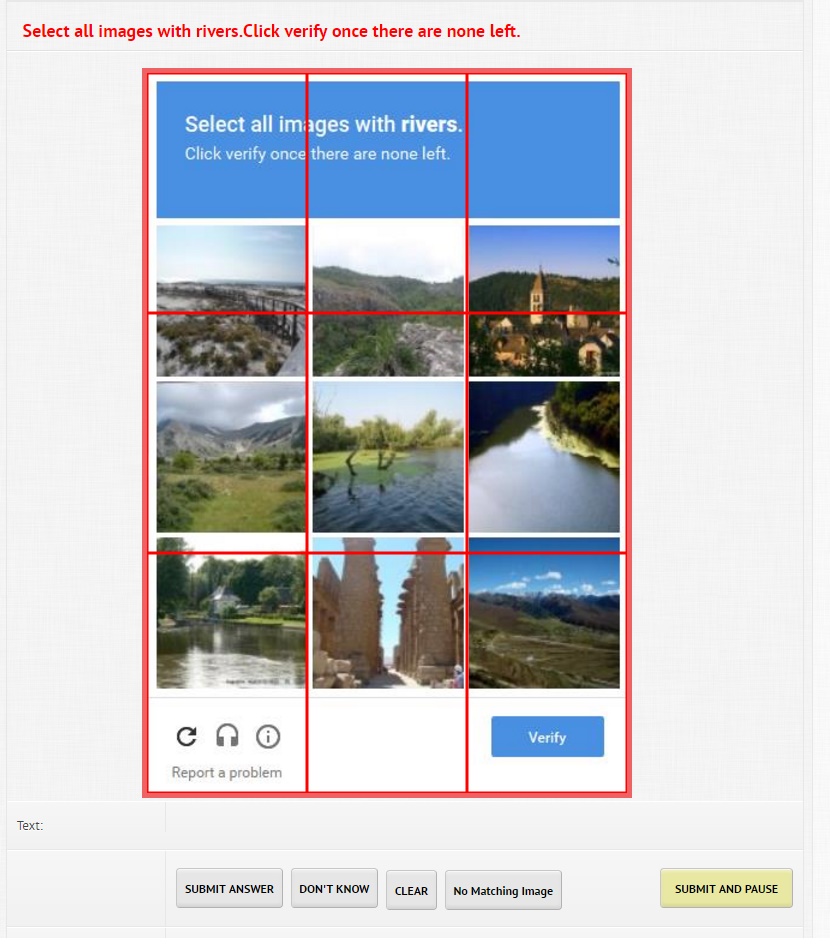 El reCaptcha es un sistema anti-bots, el cuál, requiere que identifiques una serie de imágenes, números o simplemente le des un clic para verificar que eres un humano. Una vez seguidas las sencillas instrucciones para verificar que eres humano, debería dejarte continuar al contenido. La prueba de "Escoge una imagen", trata de seleccionar la imagen que se te pide, como en este ejemplo, que se pide que elijas todas las imágenes que sean un río: