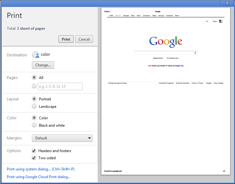 El método al que recurro es utilizar Ctrl+Shift+P (o hacer clic en Imprimir utilizando el cuadro de diálogo del sistema en ese diálogo) en vez de Ctrl+P.