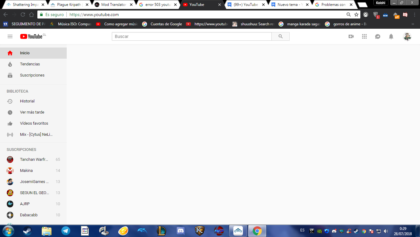 Tengo un problema, sucede que antes me ponia a actualizar la página de youtube para buscar nuevas recomendaciones y me doy cuenta que la lista no cambiaba en nada, procedi a eliminar los videos con la pestaña de no me interesa y ahora mi pestaña se quedó en blanco, yo creia que era problema de mi google chrome pero entre a la apk de mi celular y tampoco me salia ningun video, las pestañas de tendencias y suscripciones funcionaban a la perfeccion pero la página de inicio seguia en blanco, la del navegador era exactamente igual, borré el caché y mi historial de videos asi como la lista de más tarde pero el problema persistia, abrí la apk de mi celular, borre la aplicacio, la reinstale y el problema persistía, pero cuando procedí a entrar con otra cuenta youtube , este funcionaba normalmente, tambien así cuando abria la pestaña de incognito en el navegador el cual no tenía ninguna cuenta de youtube loggeada, pero cuando entro con mi cuenta todos los problemas llegan solo por loggearla, ya no se que hacer.