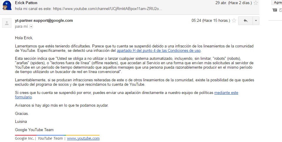 por favor! 30 segundos en verificar sean sinceros administradores...es una respuesta automatica... por eso me contacte con el equipo de soporte el cual me aseguro que el cierre de mi cuenta es debido al uso de bots que nunca use!! si quieres puedes acceder a mi canal y verificarlo