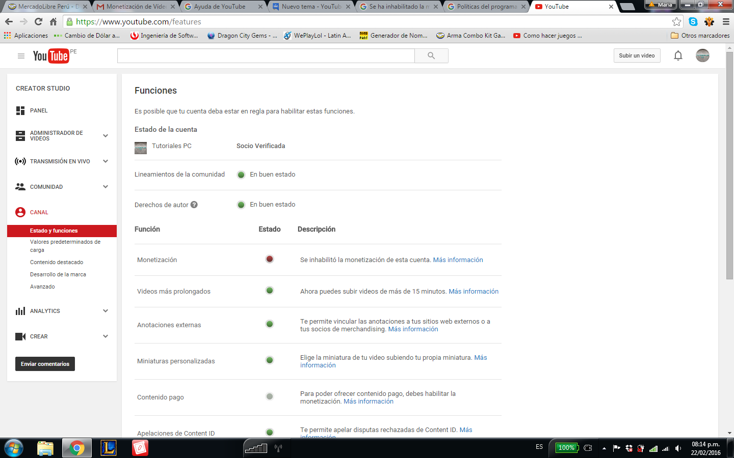 PD: He aquí una captura de pantalla: tengo mis Derechos de Autor en buen estado, y no tuve ninguna infracción; por qué entonces de golpe me cancelan la monetización? Lo lógico sería, enviar una infracción o una advertencia, pero no para bloquear esa opción.