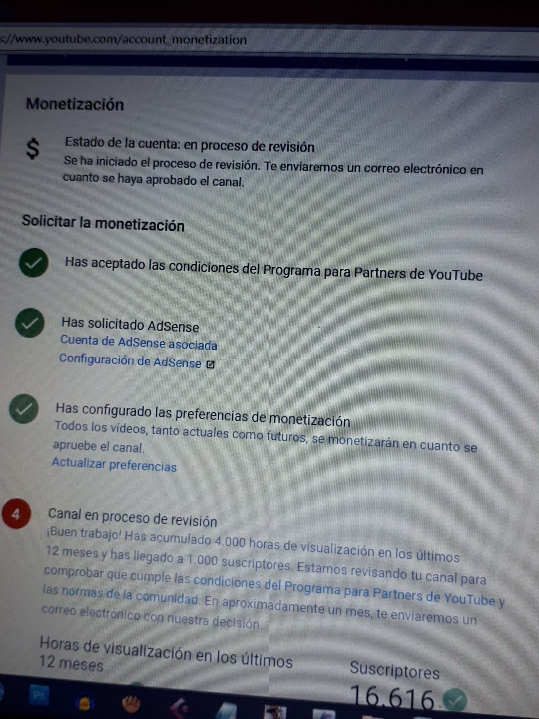 Buenas, tengo un canal con las 4 mil horas y 16 mil subscriptores https://www.youtube.com/channel/UCX8Y8lebx8KRAzzjL8-jOFA