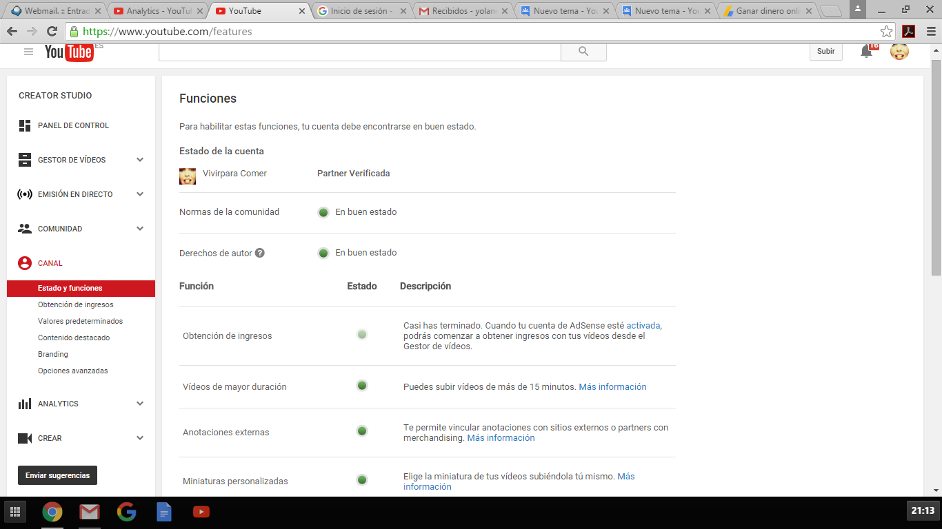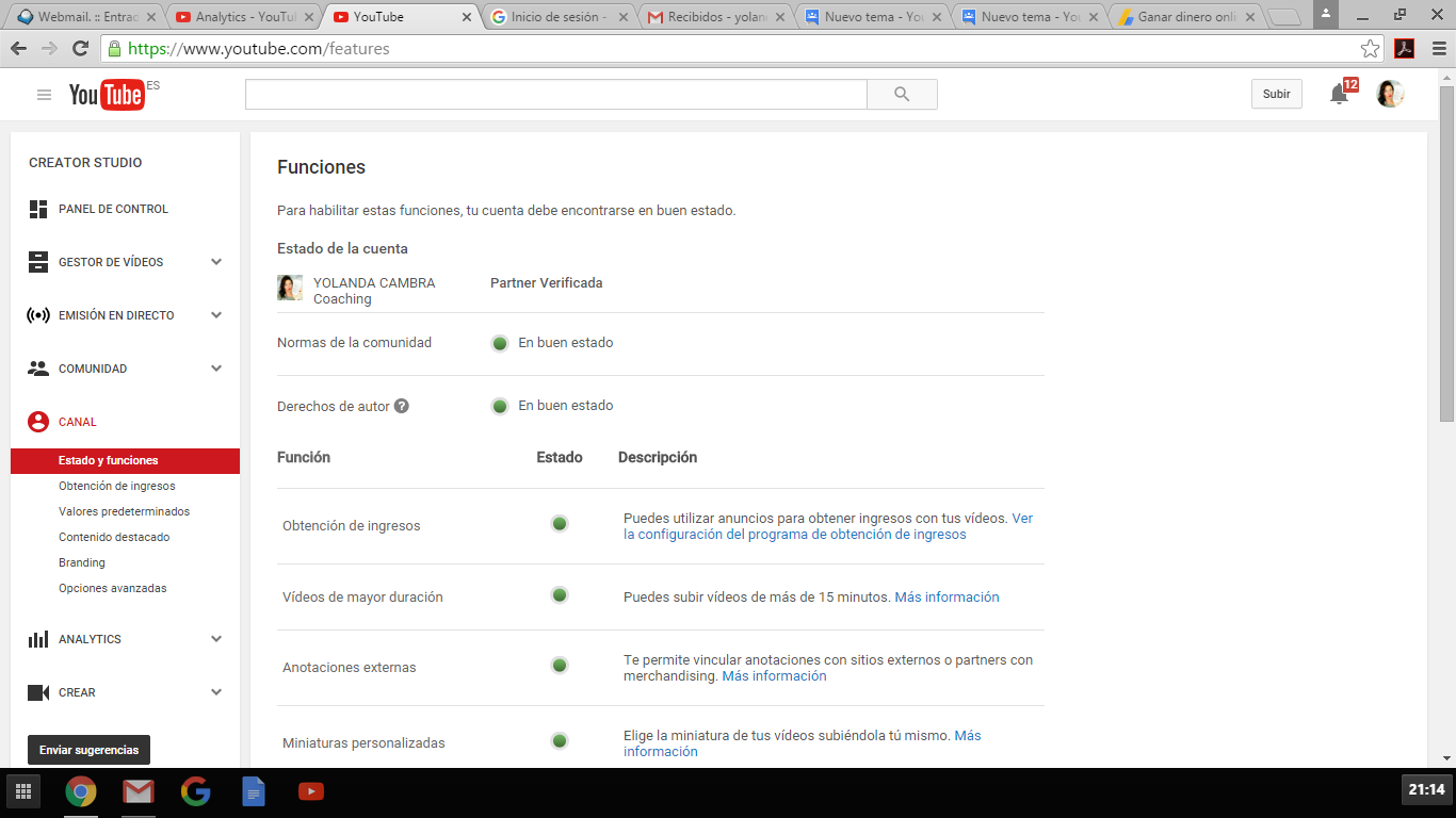 Tengo dos canales de Youtube y estoy verificada como partner desde hace 2 años, cobrando en marzo de 2015 mi primero ingreso de Youtube.